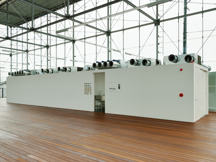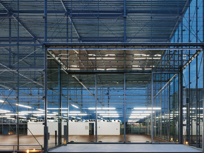 今回の建物イメージの出発点は複葉機である。複葉機は限りなく軽くすごく技術者が知恵を絞った英知の結晶である。 とはいえ目指すのは19世紀の複葉機ではない。最新の技術を駆使し、研ぎすまされた美学である。 今回の基本コンセプトは地面に置かれた限りなく透明な覆い。室内は地面の続きであって、覆いはそのエリアを囲っているに過ぎない。構造は100×100mm断面の鉄骨とそれに張られた引っ張りの線材。これだけで28×28mの無柱空間を支える。夜になるとこのスパンの1/280の太さに過ぎない部材は空間に溶け込み消え失せてしまう。構造部材の色にはF15戦闘機の色を調合するため、作業所長に佐世保まで出向いて頂いた。空に消え失せる色を欲したからである。