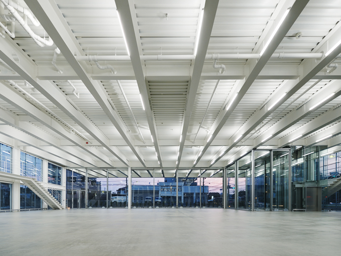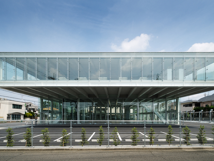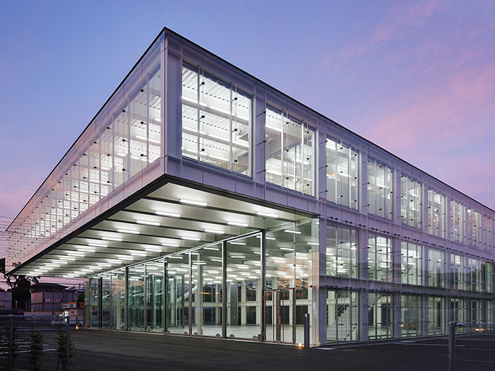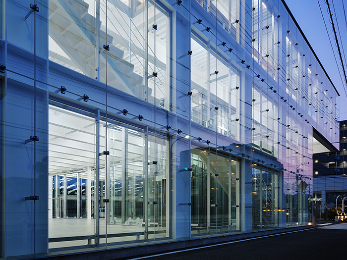 医療機器メーカーの倉庫、オフィス及びショールーム。3つの要素を面積や車の動線等厳しい敷地条件に対し、最大限効率よくおさめ、かつ企業のイメージに相応しいデザインを心がけた。 1階倉庫は28m×22mの大空間。邪魔になる柱が一切なく使い易い。2階はオフィスとショールーム。客室との間には廊下がなくひとつづきとなっている構成で、限られた面積を有効活用している。オフィス部分は地上より6.5m上に位置し、下には何もなく宙に浮いた状態。その下は間口いっぱい、深さ8mの大きな軒下空間となり、快適なサービススペースとなる。全面ガラスと鉄骨現しによる透明性の高い空間が、合理的な構成をより美しい空間へと昇華させている。